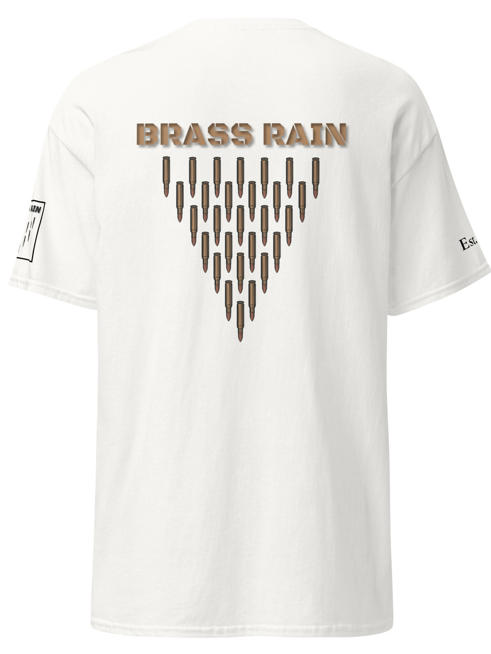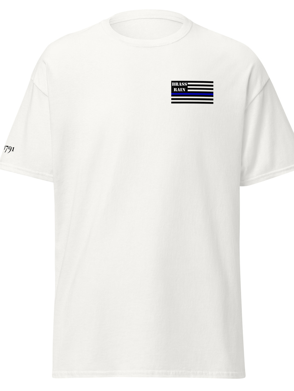 The Brass Rain Thin Blue Line Tee strips everything down to the essentials. No loud graphics. No explanations. Just a clean white shirt with a subtle chest hit that says exactly what it needs to say.